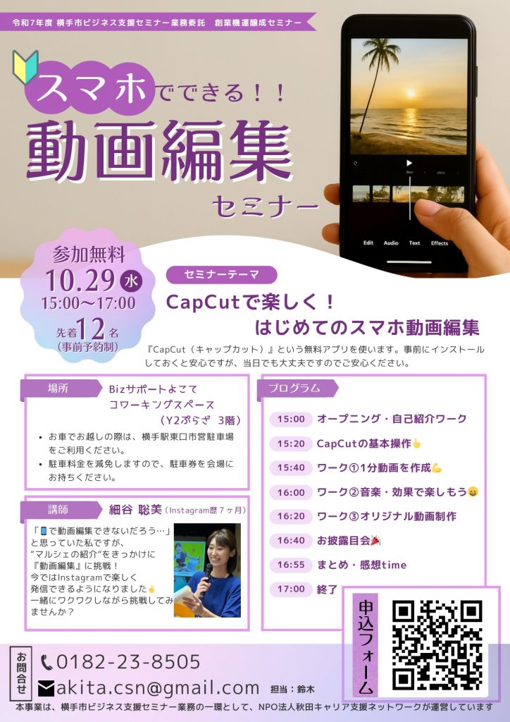 令和7年度横手市創業機運醸成セミナー第4弾 「スマホでできる!!動画編集セミナー」を開催します。